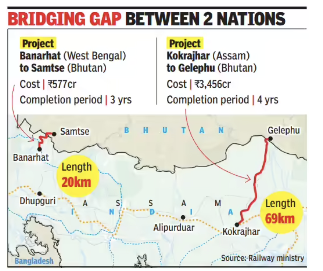 ►인도와 부탄 간 최초의 철도 연결 사업인 69km 길이의 코크라자르(인도)-겔레푸(부탄) 노선이 인도의 '특별 철도 프로젝트(SRP)'로 지정되었다. 인도 동북부 국경철도는 이 프로젝트가 양국 관계 강화 및 국가 안보에 중요한 전략적 가치를 지닌다며, 토지 수용과 건설 절차를 신속히 진행하기 위해 이같이 지정했다고 밝혔다. 이 사업은 인도 정부의 '신동방정책 Act East policy'의 일환으로 추진된다.