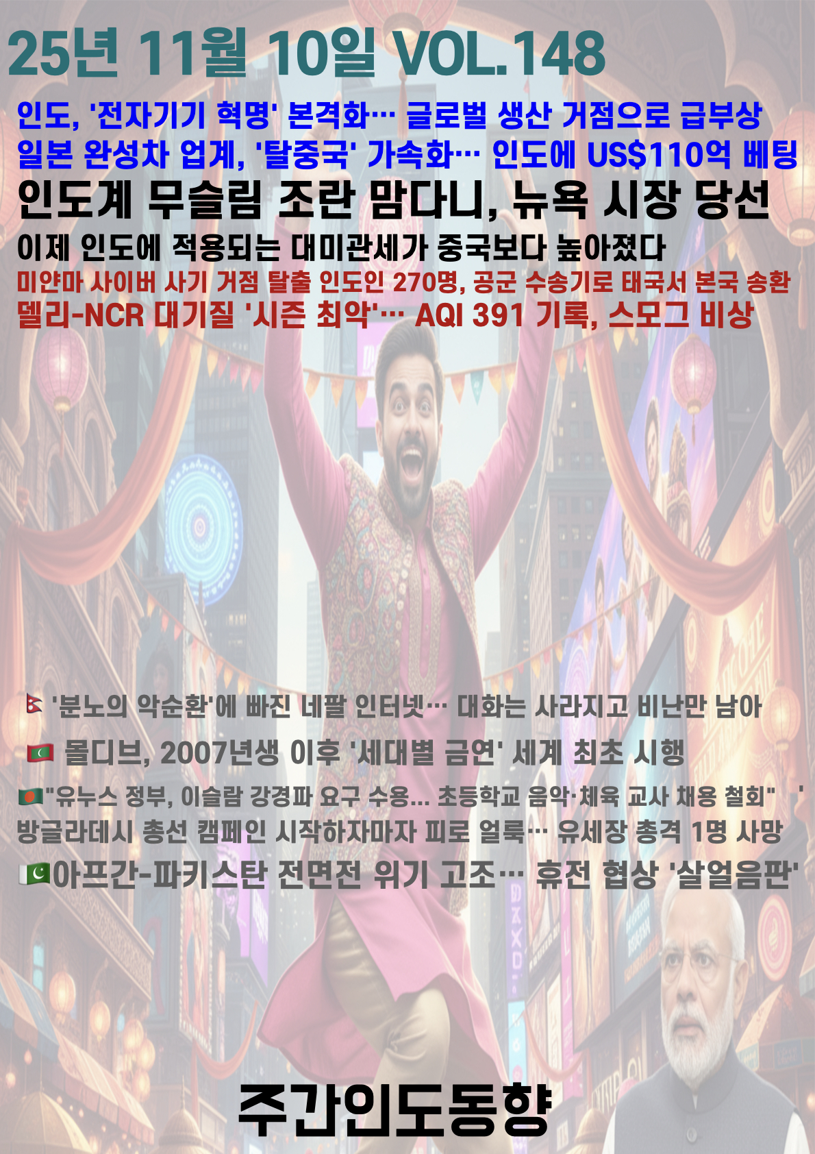 ►인도계 이민자 가정 출신의 무슬림 조란 맘다니 Zohran Mamdani가 뉴욕 시장에 당선되며 역사상 첫 남아시아계 시장이 되었다. 우간다 출생으로 뉴욕 퀸즈를 기반으로 활동해 온 그는 민주적 사회주의자를 자처하며 트럼프 행정부의 반이민 정책에 맞서는 상징적 인물로 부상했다.