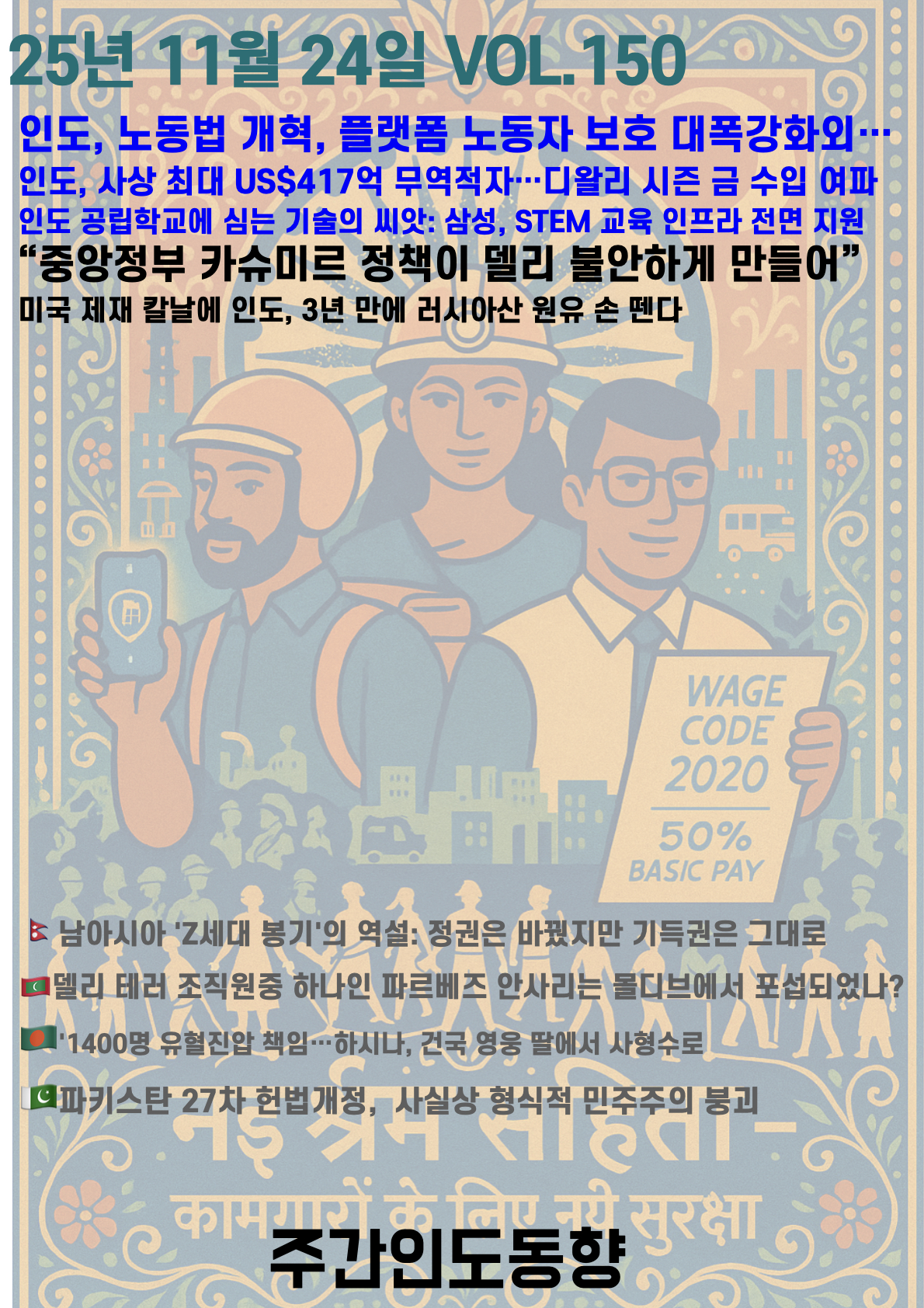 ►인도 정부가 2020년 의회를 통과한 4대 노동법(임금, 노사관계, 사회보장, 산업안전보건)에 대한 최종시행을 시작했다. 이는 영국 식민지 시대의 낡은 규정을 포함한 기존 29개 노동 관련 법률을 통합 및 폐지한 것으로, 수백만 근로자의 보호 범위를 확대하고 시스템을 현대화하기 위한 조치다.