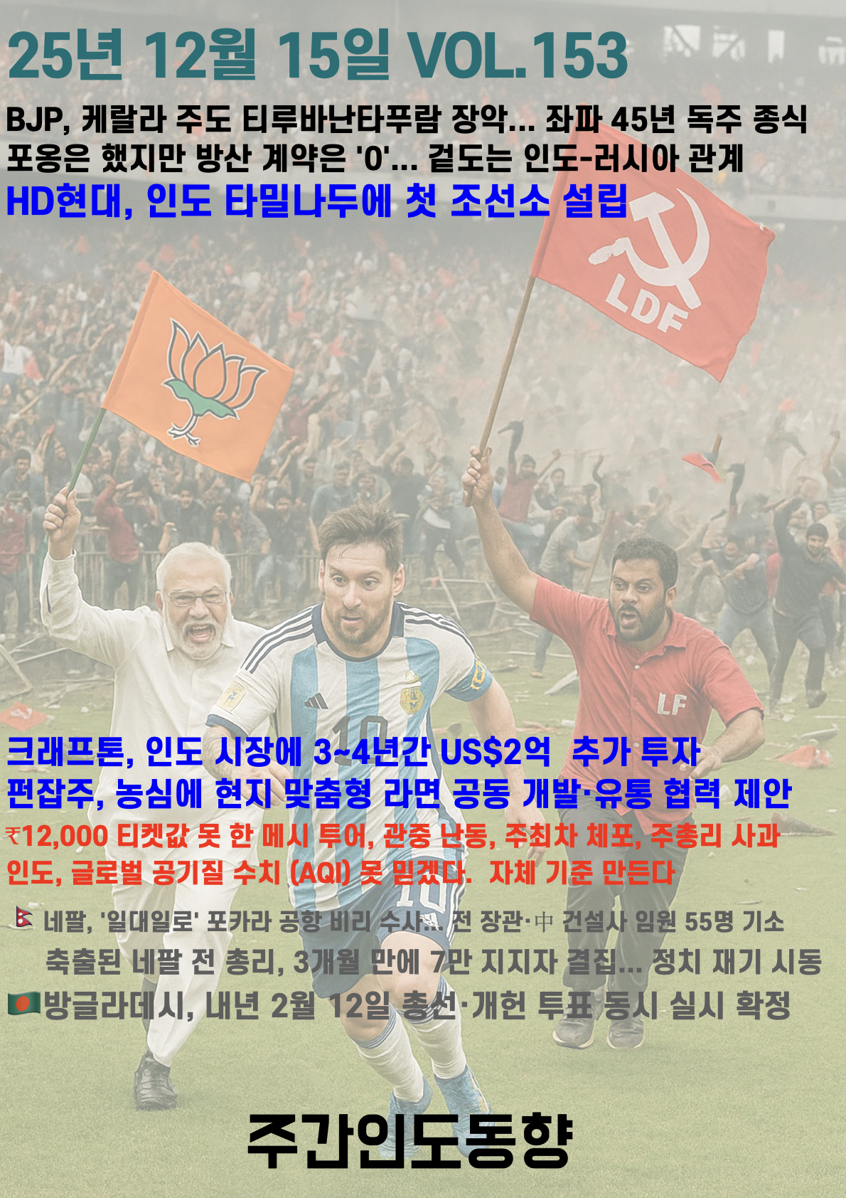 ►인도 집권 여당인 BJP가 주도하는 NDA가 케랄라주의 주도인 티루바난타뿌람 Thiruvananthapuram 시의회 선거에서 승리하며, 인도공산당CPI(M) 중심의 좌파민주전선 LDF 이 45년간 유지해 온 장기 집권을 종식시켰다. 이는 2026년 주 의회 선거를 앞두고 남부 힌두교 다수 지역에서 BJP의 정치적 입지를 크게 강화하는 계기가 될 것으로 전망된다.